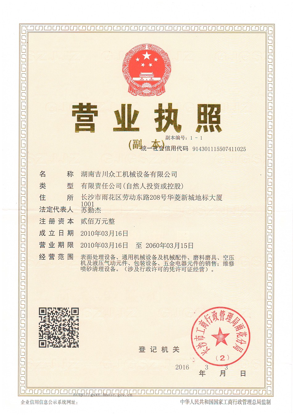 湖南吉川众工机械设备有限公司营业执照